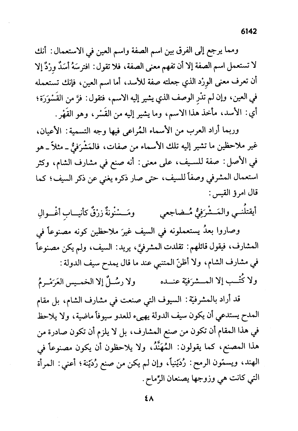 قد أراد بالمشرفيّة: السيوف التي صنعت في مشارف الشام، بل مقام المدح يستدعي أن يكون سيف الدولة يهيئ للعدو سيوفاً ماضية، ولا يلاحظ في هذا المقام أن تكون من صنع المشارف، بل لا يلزم أن تكون صادرة من هذا المصنع، كما يقولون: المُهَنَّدُ، ولا يلاحظون أن يكون مصنوعاً في الهند، ويسمّون الرمح: رُدْيْنياً، وإن / يكن من صنع رُدَيْنة؛ أعني: المرأة التي كانت هي وزوجها يصنعان الرِّماح.
