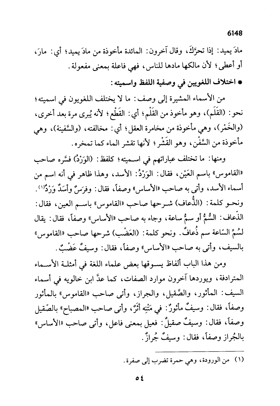 ومنها: ما تختلف عباراتهم في اسميته؛ كلفظ: (الوَرْدُ) فسَّره صاحب "القاموس" باسم العَيْن، فقال: الوَرْدُ: الأسد، وهذا ظاهر في أنه اسم من أسماء الأسد، وأتى به صاحب "الأساس" وصفاً، فقال: وفرَسٌ وأسَدٌ وَرْدٌ (¬1). ونحو كلمة: (الذُّعاف) شرحها صاحب "القاموس" باسم العين، فقال: الذّعاف: السُّمُّ أو سمُّ ساعة، وجاء به صاحب "الأساس" وصفاً، فقال: يقال لسُمِّ الساعة سم ذُعافٌ ونحو كلمة: (العَضْب) شرحها صاحب "القاموس" بالسيف، وأتى به صاحب "الأساس" وصفاً، فقال: وسيفٌ عَضْبٌ.