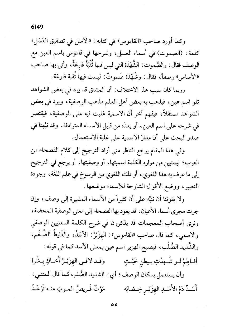 ولا يفوتنا أن ننبِّه على أن كثيراً من الأسماء المشيرة إلى وصف، وإن جرت مجرى أسماء الأعيان، قد يعود بها الفصحاء إلى معنى الوصفية المحضة، ونرى أصحاب المعجمات قد يذكرون في شرح الكلمة المعنيين الوصفي والاسمي، كما قال صاحب "القاموس": الهِزَبْرُ: الأسَدُ، والغَليظُ الضَّخْم، والشَّديد الصُّلْب، فيصبح الهزير اسم عين بمعنى الأسد كما في قوله: