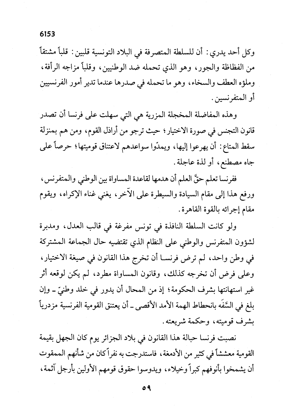 ولو كانت السلطة النافذة في تونس مفرغة في قالب العدل، ومدبرة لشؤون المتفرنس والوطني على النظام الذي تقتضيه حال الجماعة المشتركة في وطن واحد، لم ترض فرنسا أن تخرج هذا القانون في صيغة الاختيار، وعلى فرض أن تخرجه كذلك، وقانون المساواة مطرد، لم يكن لوقعه أثر غير استهانتها بشرف الحكومة؛ إذ من المحال أن يدور في خلد وطنيّ -وإن بلغ في السَّفَه بانحطاط الهمة الأمد الأقصى- أن يعتنق القومية الفرنسية مزدرياً بشرف قوميته، وحكمة شريعته.