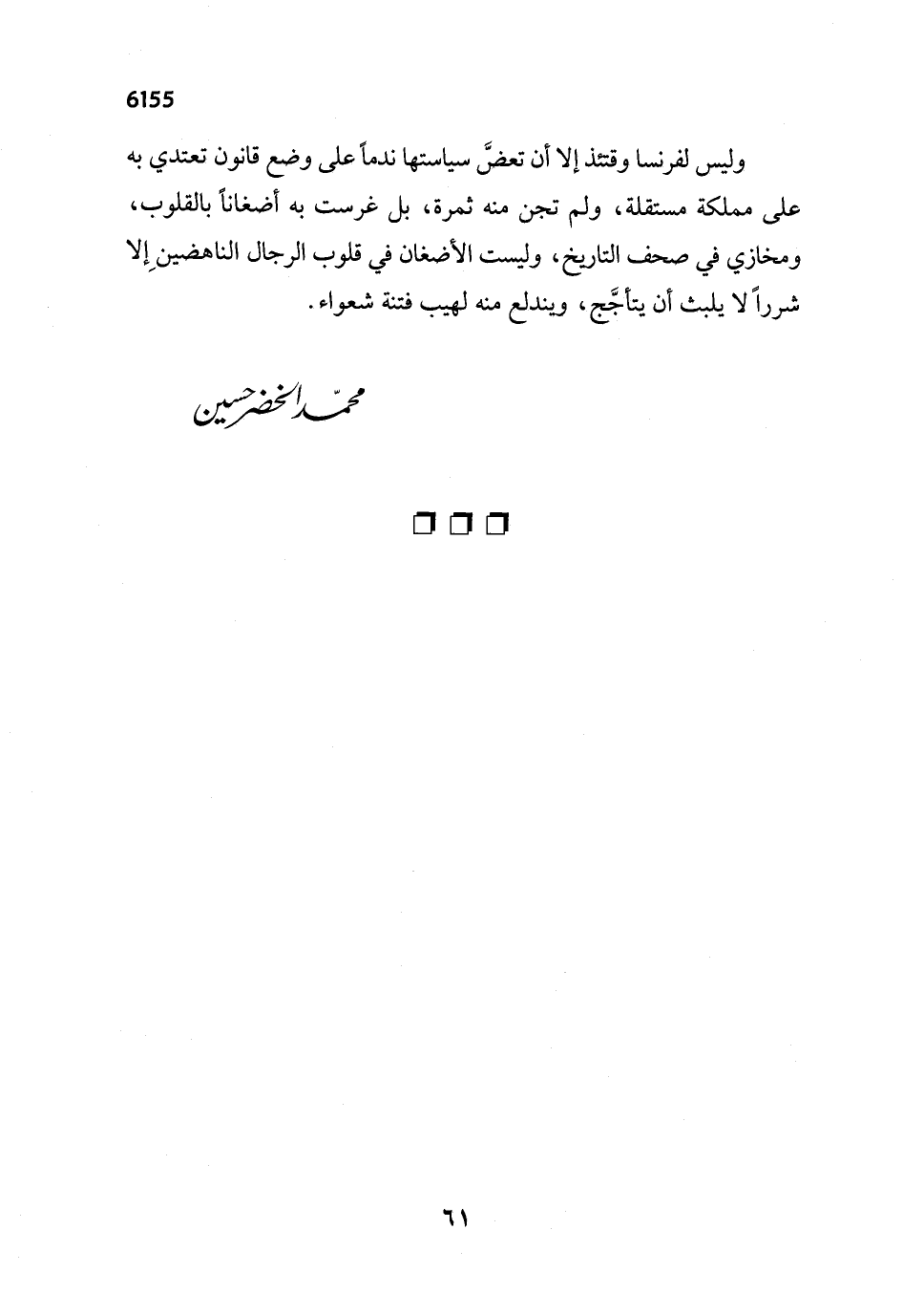 وليس لفرنسا وقتئذ إِلا أن تعضَّ سياستها ندماً على وضع قانون تعتدي به على مملكة مستقلة، ولم تجن منه ثمرة، بل غرست به أضغاناً بالقلوب، ومخازي في صحف التاريخ، وليست الأضغان في قلوب الرجال الناهضين إلا شرراً لا يلبث أن يتأجَّج، ويندلع منه لهيب فتنة شعواء.
