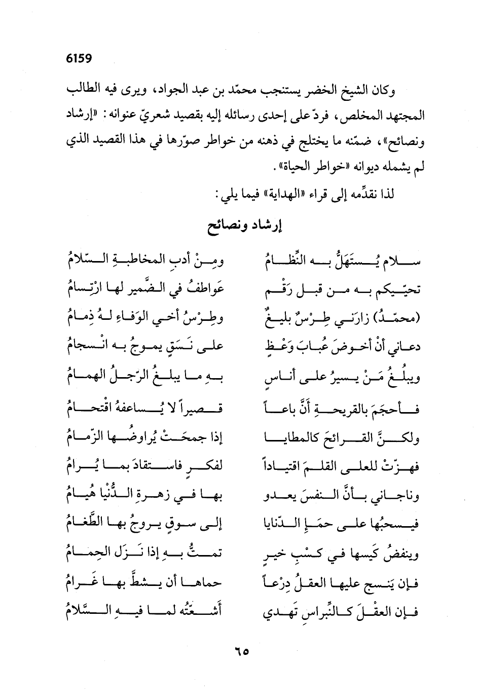 وكان الشيخ الخضر يستنجب محمّد بن عبد الجواد، ويرى فيه الطالب المجتهد المخلص، فردّ على إحدى رسائله إليه بقصيد شعريّ عنوانه: "إرشاد ونصائح"، ضمّنه ما يختلج في ذهنه من خواطر صوّرها في هذا القصيد الذي لم يشمله ديوانه "خواطر الحياة".