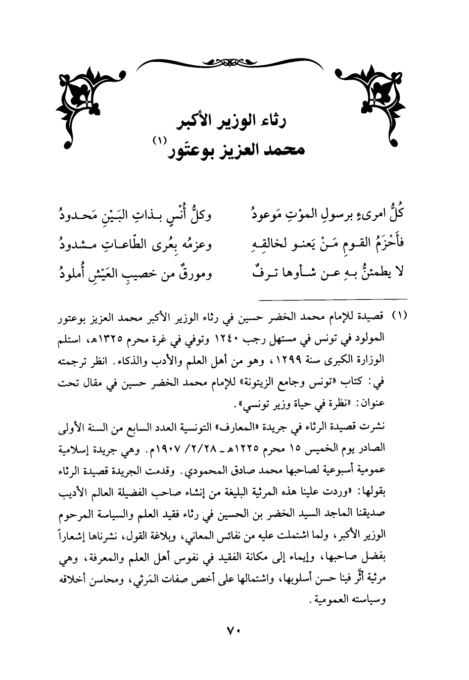 (¬1) قصيدة للإمام محمد الخضر حسين في رثاء الوزير الأكبر محمد العزيز بوعتور المولود في تونس في مستهل رجب 1240 وتوفي في غرة محرم 1325 هـ، استلم الوزارة الكبرى سنة 1299، وهو من أهل العلم والأدب والذكاء. انظر ترجمته في: كتاب "تونس وجامع الزيتونة" للإمام محمد الخضر حسين في مقال تحت عنوان: "نظرة في حياة وزير تونسي".