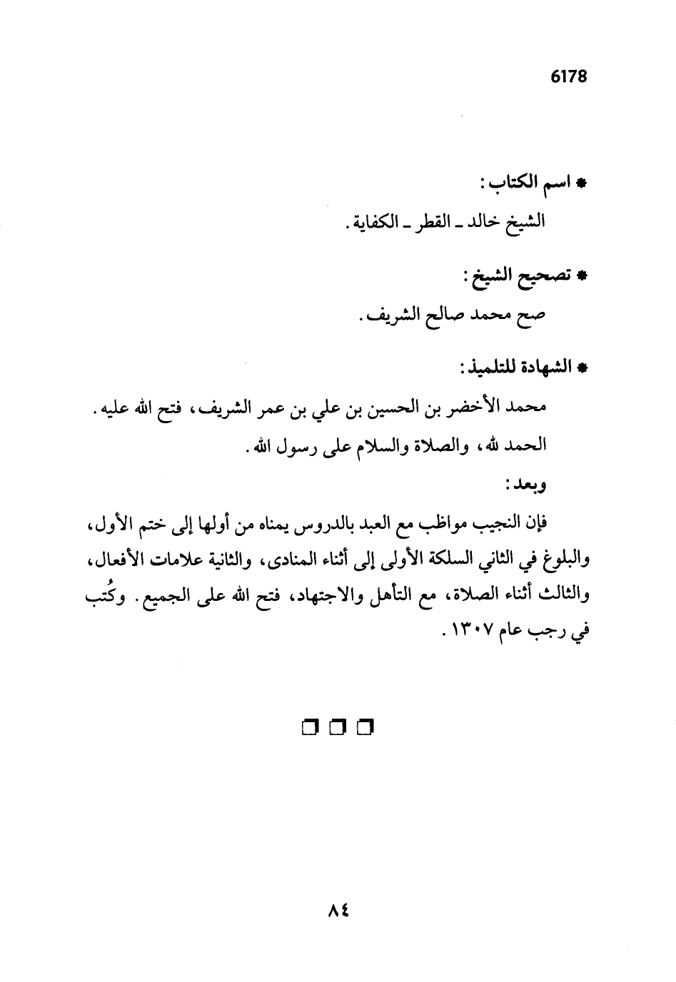 فإن النجيب مواظب مع العبد بالدروس يمناه من أولها إلى ختم الأول، والبلوغ في الثاني السلكة الأولى إلى أثناء المنادى، والثانية علامات الأفعال، والثالث أثناء الصلاة، مع التأهل والاجتهاد، فتح الله على الجميع. وكُتب في رجب عام 1307.