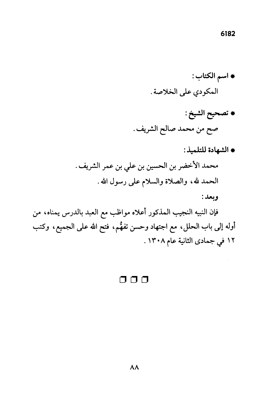 فإن النبيه النجيب المذكور أعلاه مواظب مع العبد بالدرس يمناه، من أوله إلى باب الحلل، مع اجتهاد وحسن تفهم، فتح الله على الجميع، وكتب 12 في جمادى الثانية عام 1308.