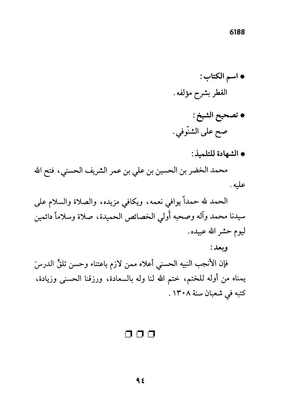 فإن الأنجب النبيه الحسني أعلاه ممن لازم باعتناء وحسن تلقٍّ الدرسَ يمناه من أوله للختم، ختم الله لنا وله بالسعادة، ورزقنا الحسنى وزيادة، كتبه في شعبان سنة 1308.