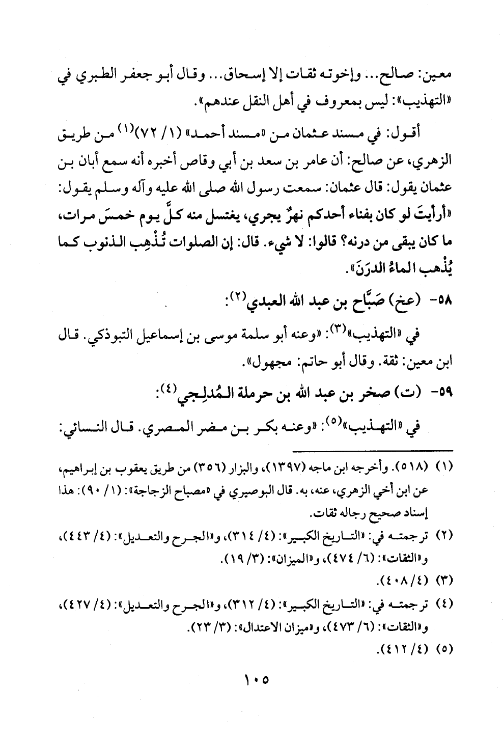 أقول: في مسند عثمان من «مسند أحمد» (١/ ٧٢) (¬١) من طريق الزهري، عن صالح: أن عامر بن سعد بن أبي وقاص أخبره أنه سمع أبان بن عثمان يقول: قال عثمان: سمعت رسول الله صلى الله عليه وآله وسلم يقول: «أرأيتَ لو كان بفناء أحدكم نهرٌ يجري، يغتسل منه كلَّ يوم خمسَ مرات، ما كان يبقى من درنه؟ قالوا: لا شيء. قال: إن الصلوات تُذْهِب الذنوب كما يُذْهب الماءُ الدرَنَ».