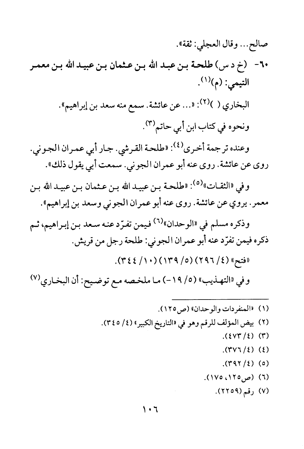 وذكره مسلم في «الوحدان» (¬٦) فيمن تفرّد عنه سعد بن إبراهيم، ثم ذكره فيمن تفرّد عنه أبو عمران الجوني: طلحة رجل من قريش.