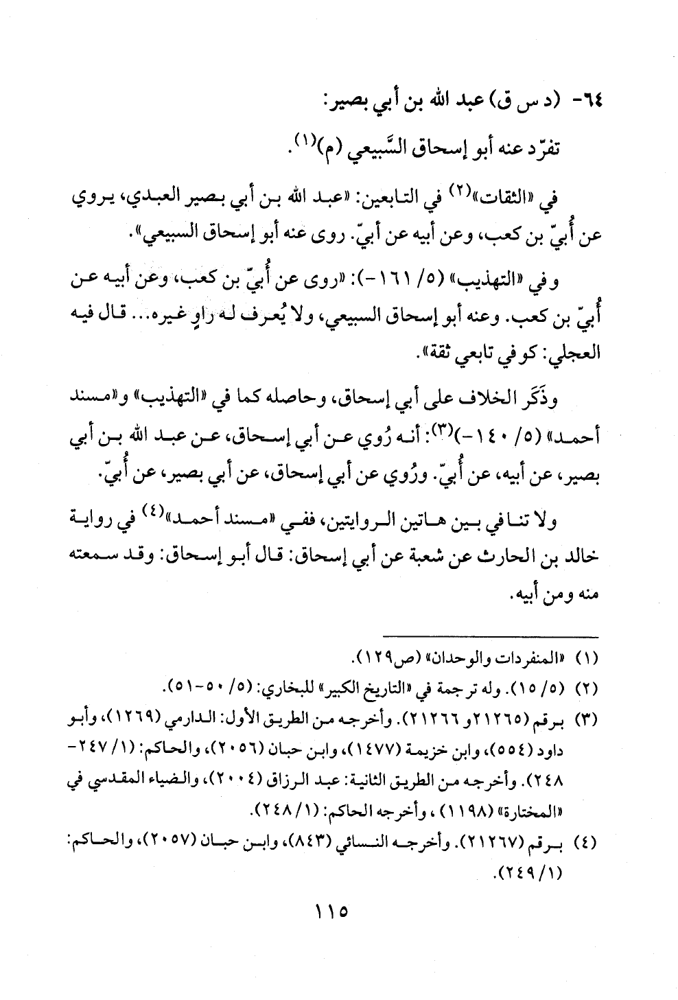 وفي «التهذيب» (٥/ ١٦١ - ): «روى عن أُبيّ بن كعب، وعن أبيه عن أُبيّ بن كعب. وعنه أبو إسحاق السبيعي، ولا يُعرف له راوٍ غيره ... قال فيه العجلي: كوفي تابعي ثقة».