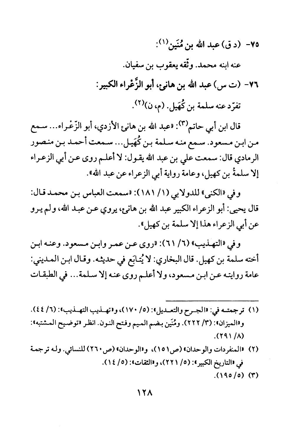 قال ابن أبي حاتم (¬٣): «عبد الله بن هانئ الأزدي، أبو الزّعْراء ... سمع من ابن مسعود. سمع منه سلمة بن كُهَيل ... سمعت أحمد بن منصور الرمادي قال: سمعت علي بن عبد الله يقول: لا أعلم روى عن أبي الزعراء إلا سلمةُ بن كهيل، وعامة رواية أبي الزعراء عن عبد الله».