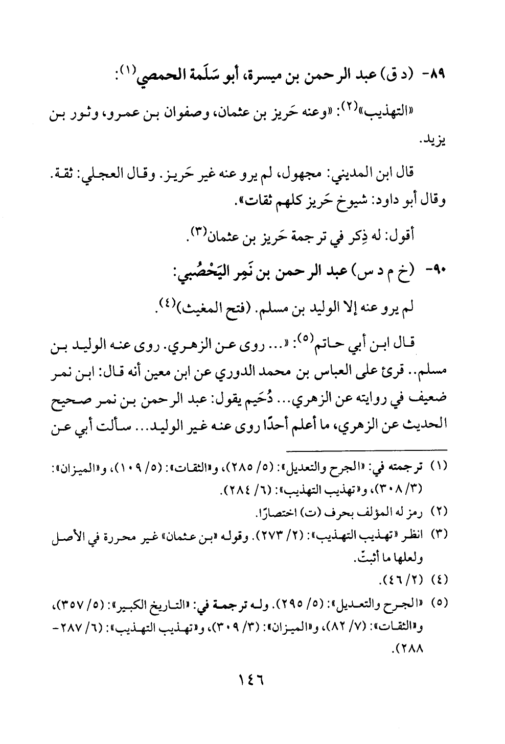 قال ابن أبي حاتم (¬٥): « ... روى عن الزهري. روى عنه الوليد بن مسلم .. قرئ على العباس بن محمد الدوري عن ابن معين أنه قال: ابن نمر ضعيف في روايته عن الزهري ... دُحَيم يقول: عبد الرحمن بن نمر صحيح الحديث عن الزهري، ما أعلم أحدًا روى عنه غير الوليد ... سألت أبي عن