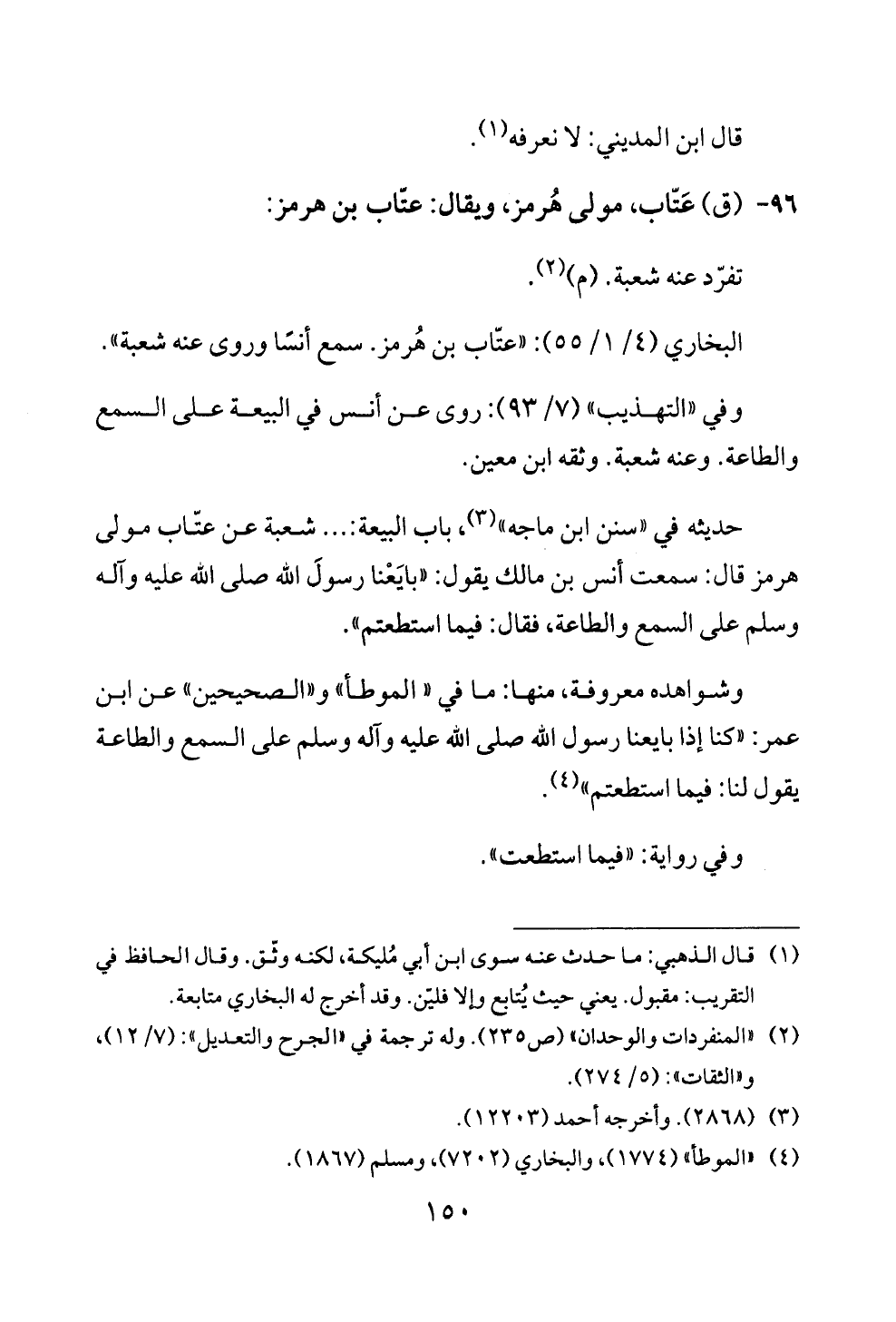 حديثه في «سنن ابن ماجه» (¬٣)، باب البيعة: ... شعبة عن عتّاب مولى هرمز قال: سمعت أنس بن مالك يقول: «بايَعْنا رسولَ الله صلى الله عليه وآله وسلم على السمع والطاعة، فقال: فيما استطعتم».