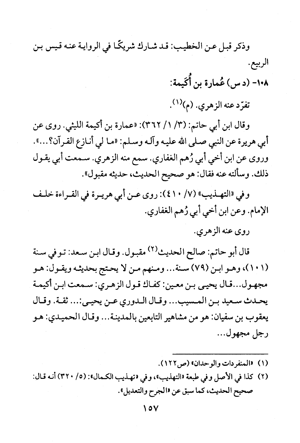 وقال ابن أبي حاتم: (٣/ ١/٣٦٢): «عمارة بن أكيمة الليثي. روى عن أبي هريرة عن النبي صلى الله عليه وآله وسلم: «ما لي أنازع القرآن؟ ... ». وروى عن ابن أخي أبي رُهم الغفاري. سمع منه الزهري. سمعت أبي يقول ذلك. وسألته عنه فقال: هو صحيح الحديث، حديثه مقبول».