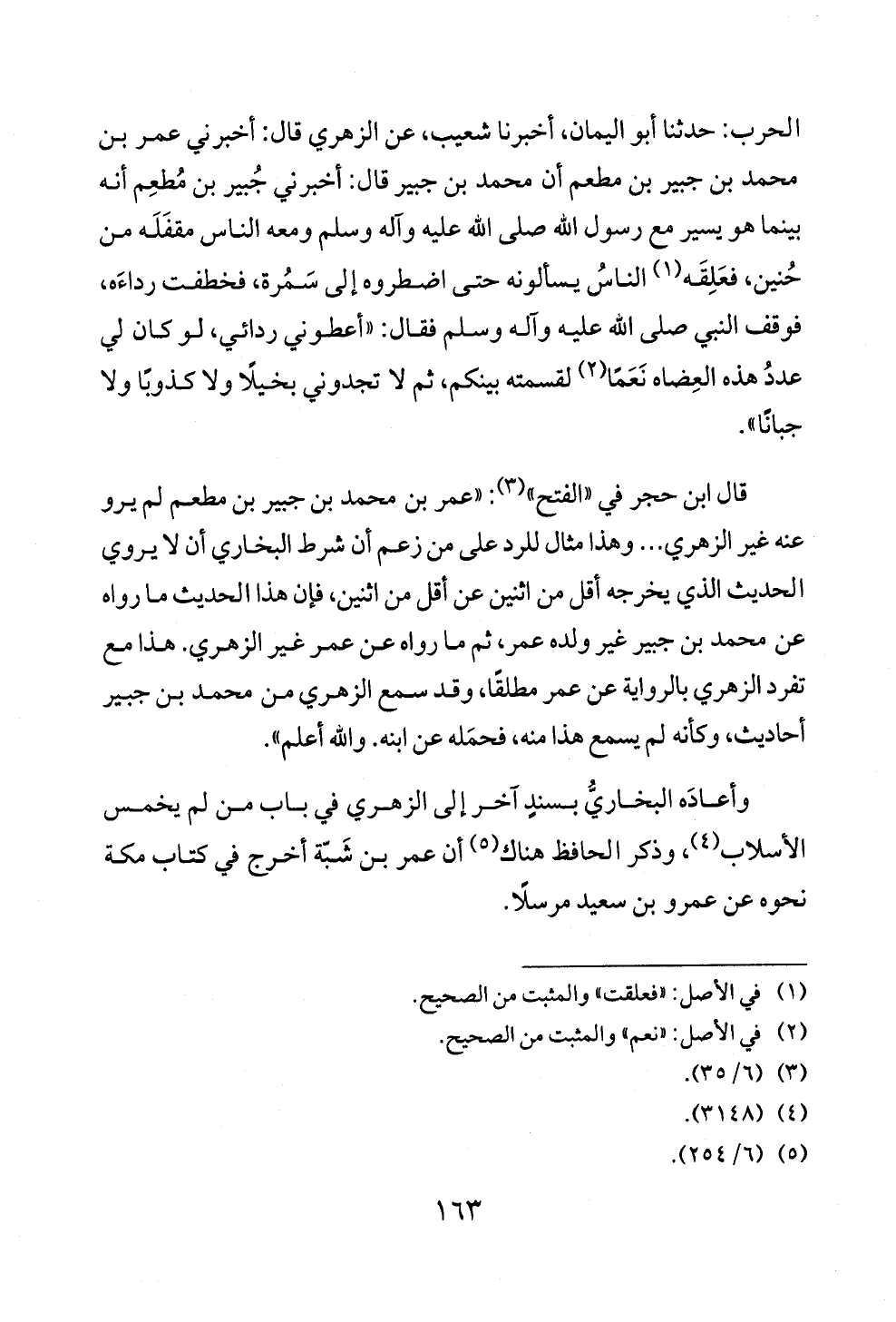 الحرب: حدثنا أبو اليمان، أخبرنا شعيب، عن الزهري قال: أخبرني عمر بن محمد بن جبير بن مطعم أن محمد بن جبير قال: أخبرني جُبير بن مُطعِم أنه بينما هو يسير مع رسول الله صلى الله عليه وآله وسلم ومعه الناس مقفَلَه من حُنين، فعَلِقَه (¬١) الناسُ يسألونه حتى اضطروه إلى سَمُرة، فخطفت رداءَه، فوقف النبي صلى الله عليه وآله وسلم فقال: «أعطوني ردائي، لو كان لي عددُ هذه العِضاه نَعَمًا (¬٢) لقسمته بينكم، ثم لا تجدوني بخيلًا ولا كذوبًا ولا جبانًا».