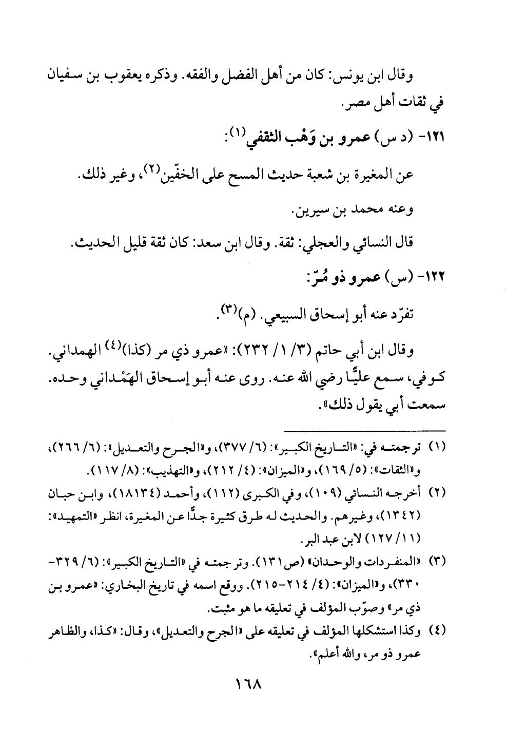(¬٤) وكذا استشكلها المؤلف في تعليقه على «الجرح والتعديل»، وقال: «كذا، والظاهر عمرو ذو مر، والله أعلم».