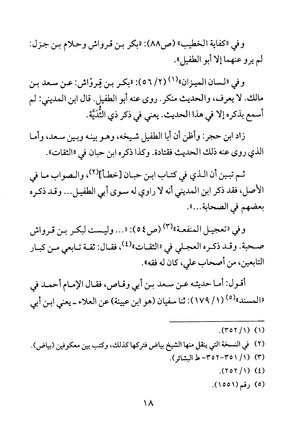 زاد ابن حجر: وأظن أن أبا الطفيل شيخه، وهو بينه وبين سعد، وأما الذي روى عنه ذلك الحديث فقتادة. وكذا ذكره ابن حبان في "الثقات".