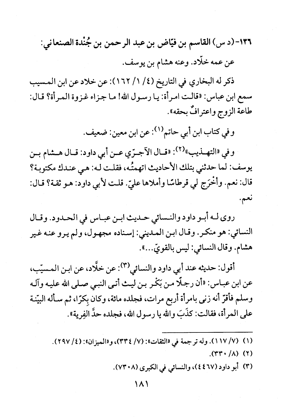 أقول: حديثه عند أبي داود والنسائي (¬٣): عن خلَّاد، عن ابن المسيّب، عن ابن عباس: «أن رجلًا من بَكْر بن ليث أتى النبي صلى الله عليه وآله وسلم فأقرّ أنه زنى بامرأة أربع مرات، فجلده مائة، وكان بِكرًا، ثم سأله البيّنة على المرأة، فقالت: كذَبَ والله يا رسول الله، فجلده حدَّ الفِرية».