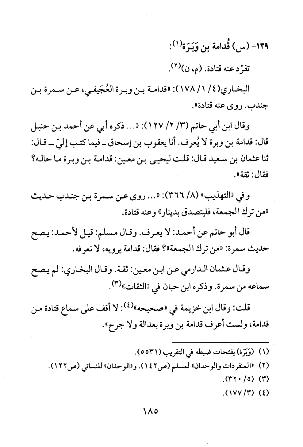 البخاري (٤/ ١/ ١٧٨): «قدامة بن وبرة العُجَيفي، عن سمرة بن جندب. روى عنه قتادة».