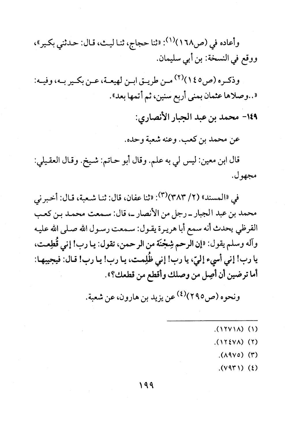 في «المسند» (٢/ ٣٨٣) (¬٣): «ثنا عفان، قال: ثنا شعبة، قال: أخبرني محمد بن عبد الجبار ــ رجل من الأنصار ــ، قال: سمعت محمد بن كعب القرظي يحدث أنه سمع أبا هريرة يقول: سمعت رسول الله صلى الله عليه وآله وسلم يقول: «إن الرحم شِجْنَة من الرحمن، تقول: يا رب! إني قُطِعت، يا رب! إني أسيء إليّ، يا رب! إني ظُلِمت، يا رب! يا رب! قال: فيجيبها: أما ترضين أن أصِل من وصلك وأقطع من قطعك؟».