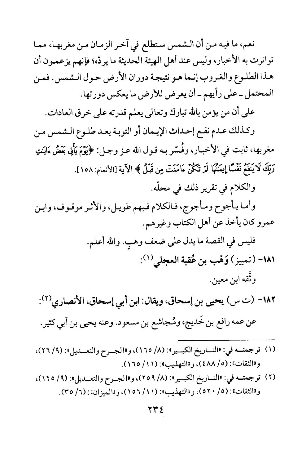 وكذلك عدم نفع إحداث الإيمان أو التوبة بعد طلوع الشمس من مغربها، ثابت في الأخبار، وفُسّر به قول الله عز وجل: {يَوْمَ يَأْتِي بَعْضُ آيَاتِ رَبِّكَ لَا يَنْفَعُ نَفْسًا إِيمَانُهَا لَمْ تَكُنْ آمَنَتْ مِنْ قَبْلُ} الآية [الأنعام: ١٥٨].
