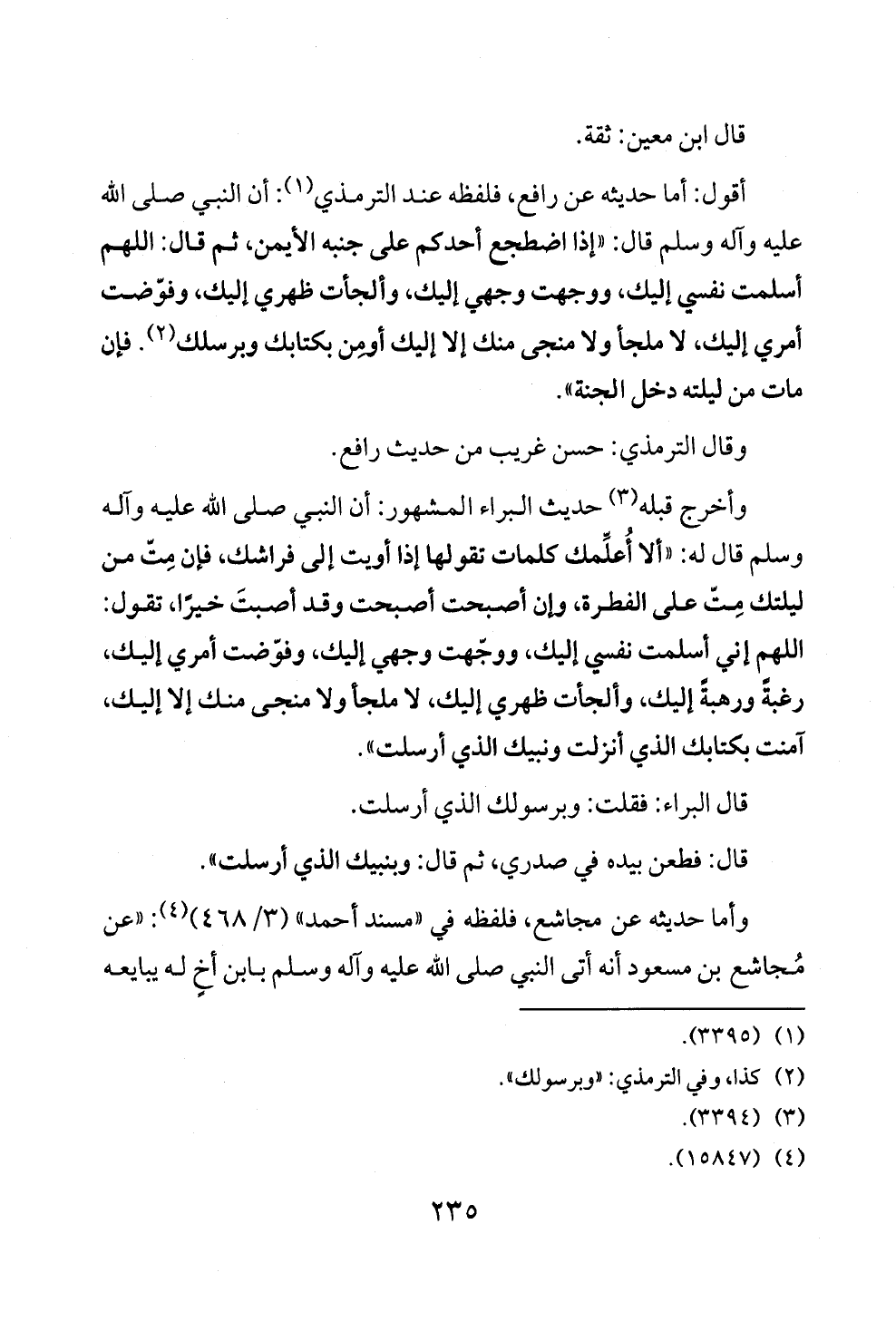 أقول: أما حديثه عن رافع، فلفظه عند الترمذي (¬١): أن النبي صلى الله عليه وآله وسلم قال: «إذا اضطجع أحدكم على جنبه الأيمن، ثم قال: اللهم أسلمت نفسي إليك، ووجهت وجهي إليك، وألجأت ظهري إليك، وفوّضت أمري إليك، لا ملجأ ولا منجى منك إلا إليك أومِن بكتابك وبرسلك (¬٢). فإن مات من ليلته دخل الجنة».