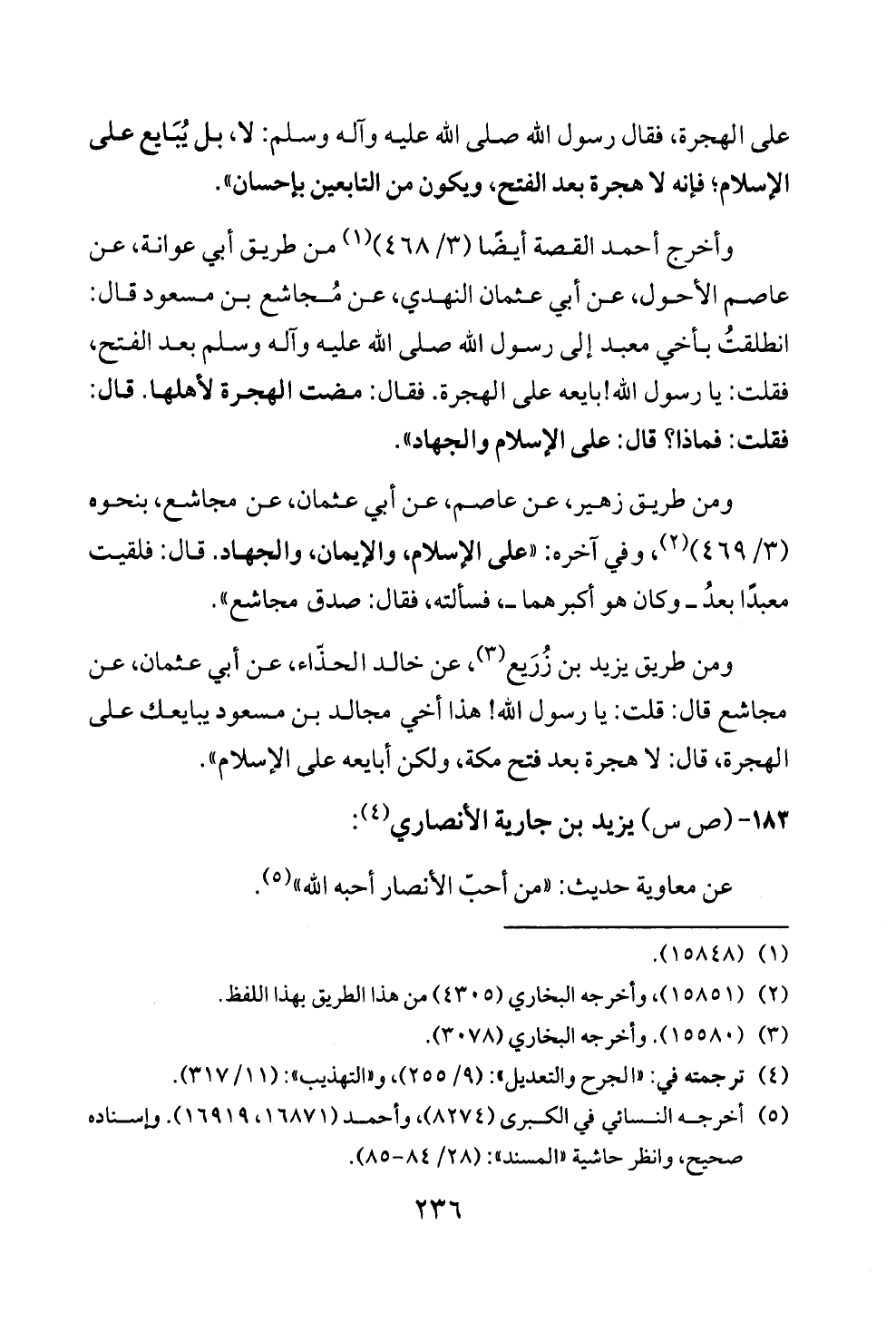 ومن طريق يزيد بن زُرَيع (¬٣)، عن خالد الحذّاء، عن أبي عثمان، عن مجاشع قال: قلت: يا رسول الله! هذا أخي مجالد بن مسعود يبايعك على الهجرة، قال: لا هجرة بعد فتح مكة، ولكن أبايعه على الإسلام».