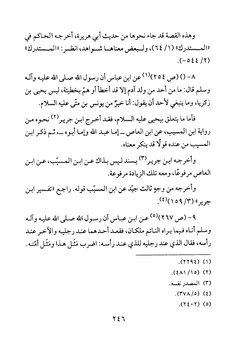 ٨ - () (ص ٢٥٤) (¬١) عن ابن عباس أن رسول الله صلى الله عليه وآله وسلم قال: ما من أحد من ولد آدم إلا قد أخطأ أو همّ بخطيئة، ليس يحيى بن زكريا، وما ينبغي لأحد أن يقول: أنا خيرٌ من يونس بن متّى عليه السلام.