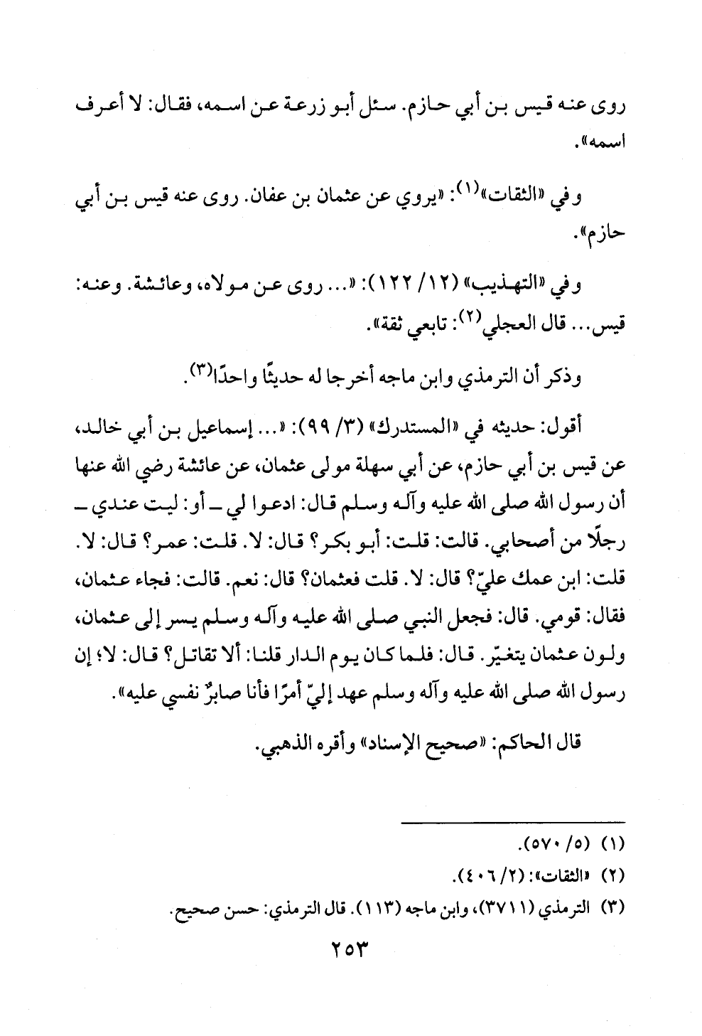 أقول: حديثه في «المستدرك» (٣/ ٩٩): « ... إسماعيل بن أبي خالد، عن قيس بن أبي حازم، عن أبي سهلة مولى عثمان، عن عائشة رضي الله عنها أن رسول الله صلى الله عليه وآله وسلم قال: ادعوا لي ــ أو: ليت عندي ــ رجلًا من أصحابي. قالت: قلت: أبو بكر؟ قال: لا. قلت: عمر؟ قال: لا. قلت: ابن عمك عليّ؟ قال: لا. قلت فعثمان؟ قال: نعم. قالت: فجاء عثمان، فقال: قومي. قال: فجعل النبي صلى الله عليه وآله وسلم يسر إلى عثمان، ولون عثمان يتغيّر. قال: فلما كان يوم الدار قلنا: ألا تقاتل؟ قال: لا؛ إن رسول الله صلى الله عليه وآله وسلم عهد إليّ أمرًا فأنا صابرٌ نفسي عليه».