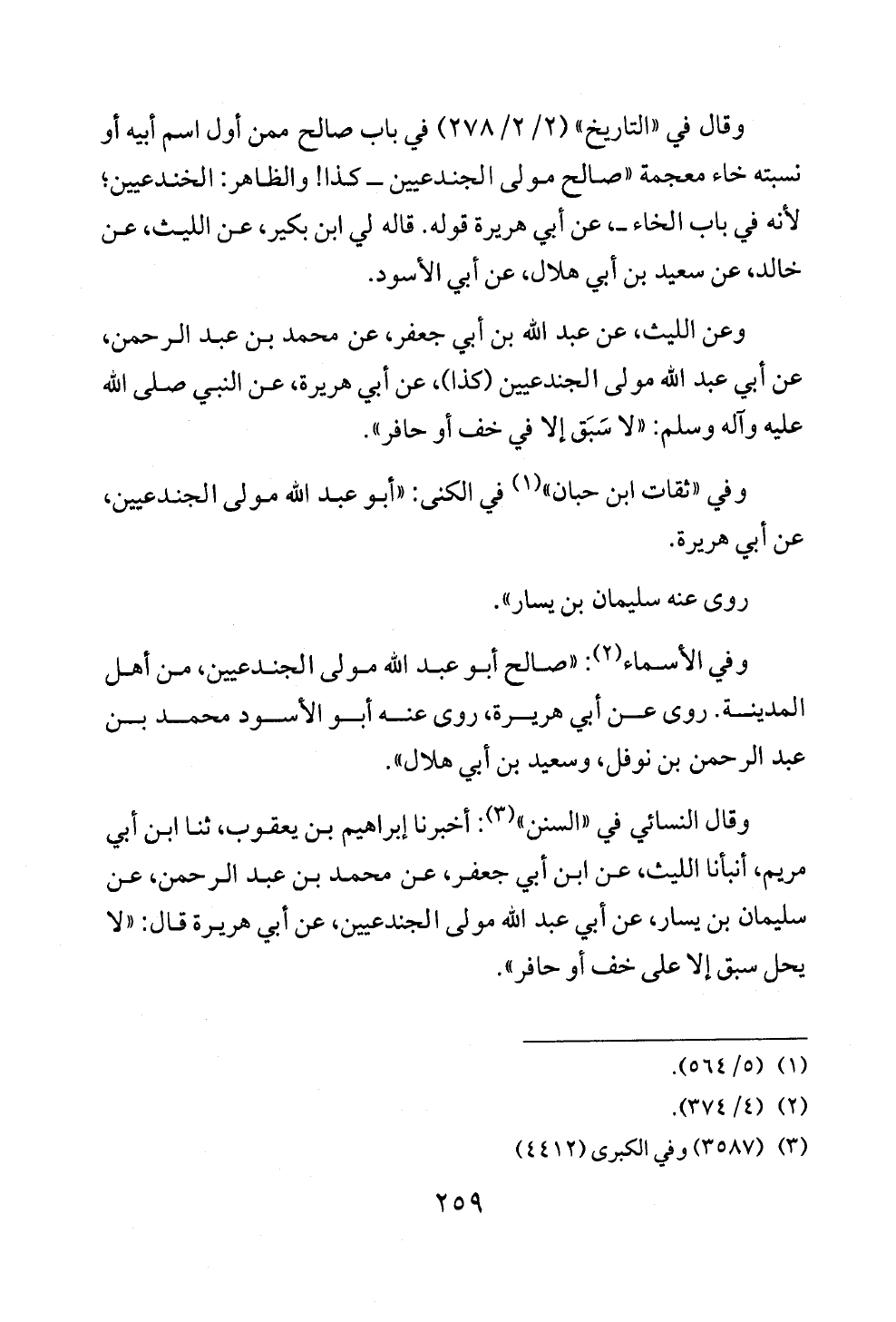 وقال النسائي في «السنن» (¬٣): أخبرنا إبراهيم بن يعقوب، ثنا ابن أبي مريم، أنبأنا الليث، عن ابن أبي جعفر، عن محمد بن عبد الرحمن، عن سليمان بن يسار، عن أبي عبد الله مولى الجندعيين، عن أبي هريرة قال: «لا يحل سبق إلا على خف أو حافر».
