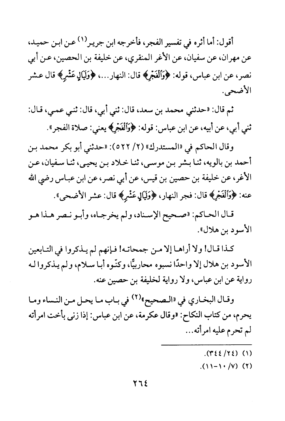 وقال الحاكم في «المستدرك» (٢/ ٥٢٢): «حدثني أبو بكر محمد بن أحمد بن بالويه، ثنا بشر بن موسى، ثنا خلاد بن يحيى، ثنا سفيان، عن الأغر، عن خليفة بن حصين بن قيس، عن أبي نصر، عن ابن عباس رضي الله عنه: {وَالْفَجْرِ} قال: فجر النهار، {وَلَيَالٍ عَشْرٍ} قال: عشر الأضحى».
