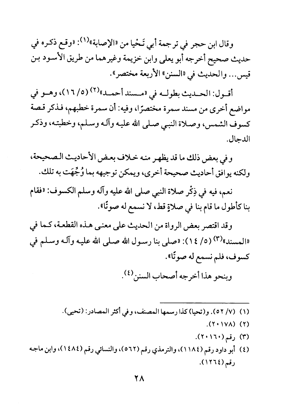 وقد اقتصر بعض الرواة من الحديث على معنى هذه القطعة، كما في "المسند" (¬٣) (٥/ ١٤): "صلى بنا رسول الله صلى الله عليه وآله وسلم في كسوف، فلم نسمع له صوتًا".