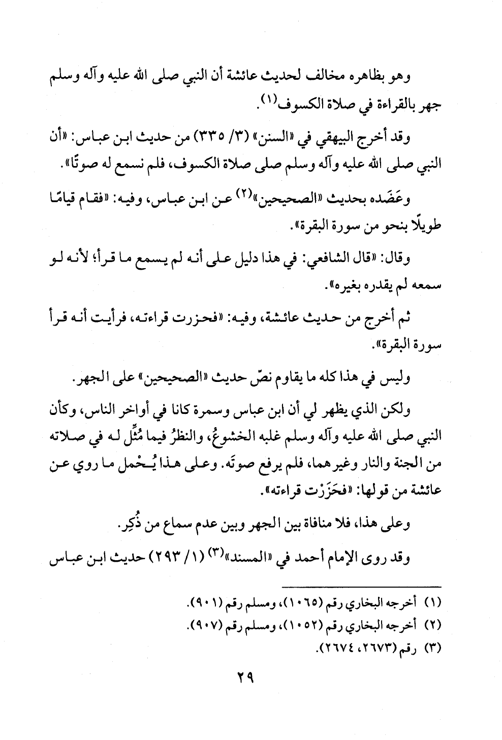 ولكن الذي يظهر لي أن ابن عباس وسمرة كانا في أواخر الناس، وكأن النبي صلى الله عليه وآله وسلم غلبه الخشوعُ، والنظرُ فيما مُثِّل له في صلاته من الجنة والنار وغيرهما، فلم يرفع صوتَه. وعلى هذا يُحْمل ما روي عن عائشة من قولها: "فحَزَرْت قراءته".