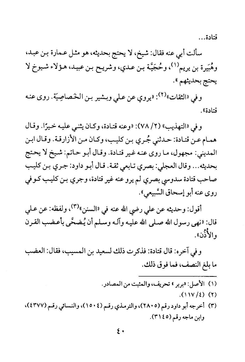 أقول: وحديثه عن علي رضي الله عنه في "السنن" (¬٣)، ولفظه: عن علي قال: "نهى رسول الله صلى الله عليه وآله وسلم أن يُضحَّى بأعضب القرن والأُذُن".