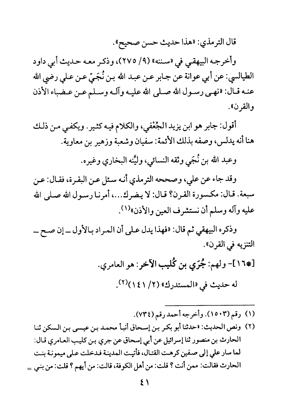 (¬٢) ونص الحديث: "حدثنا أبو بكر بن إسحاق أنبأ محمد بن عيسى بن السكن ثنا الحارث بن منصور ثنا إسرائيل عن أبي إسحاق عن جري بن كليب العامري قال: لما سار علي إلى صفين كرهت القتال، فأتيت المدينة فدخلت على ميمونة بنت الحارث فقالت: ممن أنت؟ قلت: من أهل الكوفة، قالت: من أيهم؟ قلت: من بني عامر، قالت: رحبًا على رحب وقربًا على قرب تجيء ما جاء بك قال: قلت: سار علي إلى صفين وكرهت القتال فجئنا إلى ها هنا، قالت: أكنت بايعته؟ قال: قلت: نعم، قالت: فارجع إليه فكن معه، فوالله ما ضل ولا ضل به.