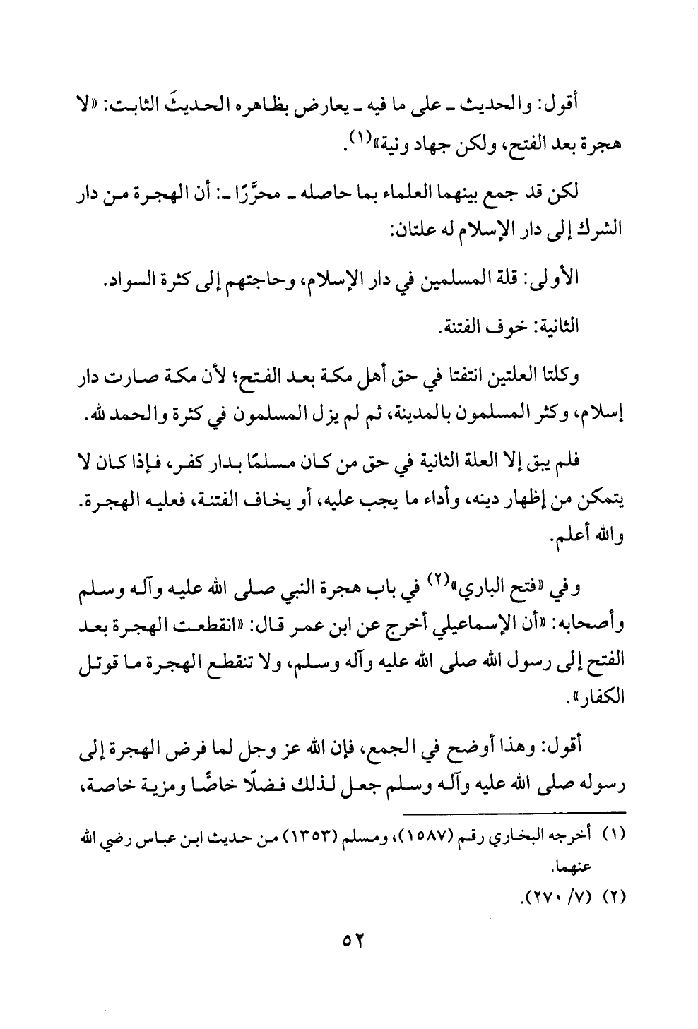 وفي "فتح الباري" (¬٢) في باب هجرة النبي صلى الله عليه وآله وسلم وأصحابه: "أن الإسماعيلي أخرج عن ابن عمر قال: "انقطعت الهجرة بعد الفتح إلى رسول الله صلى الله عليه وآله وسلم، ولا تنقطع الهجرة ما قوتل الكفار".