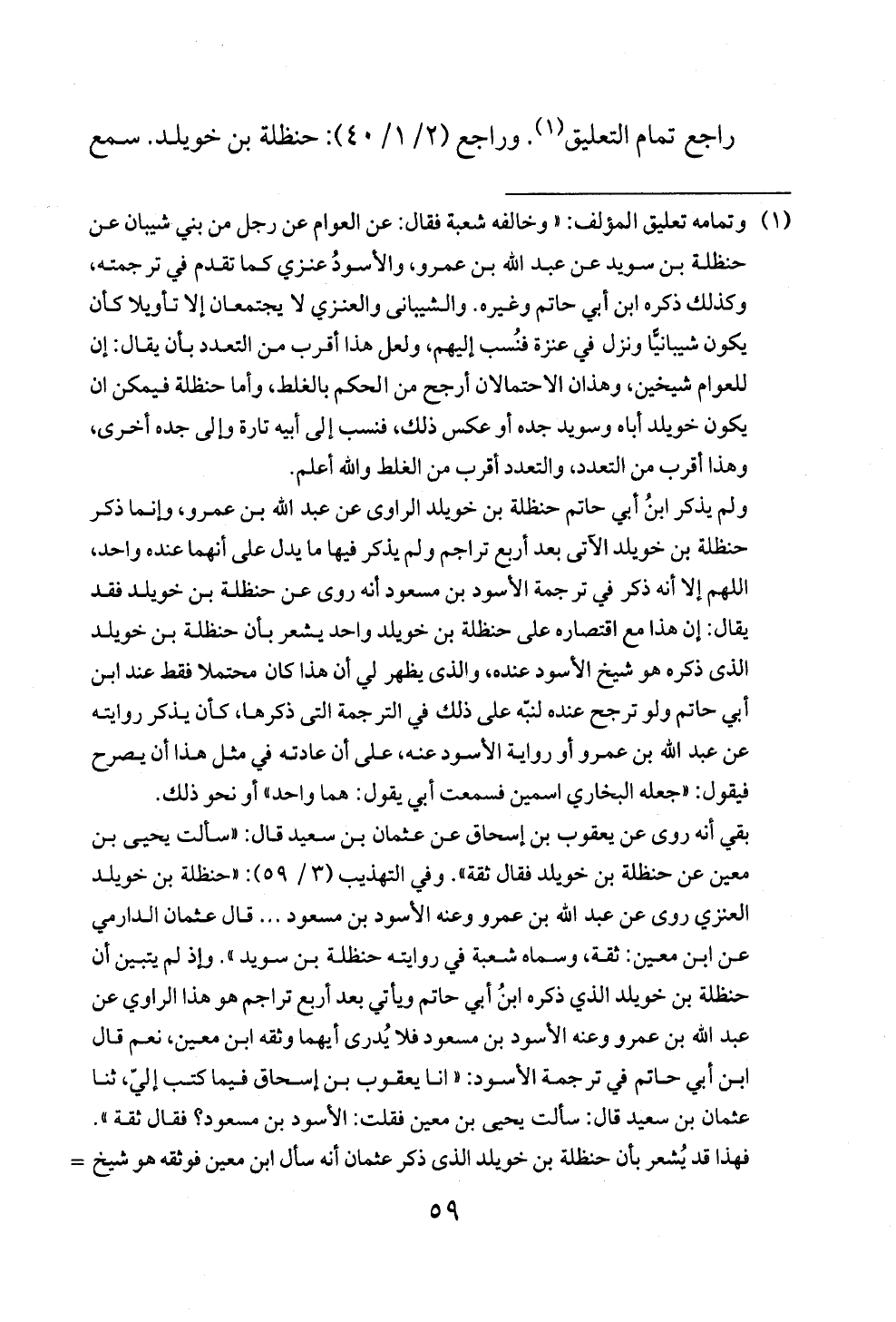 (¬١) وتمامه تعليق المؤلف: «وخالفه شعبة فقال: عن العوام عن رجل من بني شيبان عن حنظلة بن سويد عن عبد الله بن عمرو، والأسودُ عنزي كما تقدم في ترجمته، وكذلك ذكره ابن أبي حاتم وغيره. والشيبانى والعنزي لا يجتمعان إلا تأويلا كأن يكون شيبانيًّا ونزل في عنزة فنُسب إليهم، ولعل هذا أقرب من التعدد بأن يقال: إن للعوام شيخين، وهذان الاحتمالان أرجح من الحكم بالغلط، وأما حنظلة فيمكن ان يكون خويلد أباه وسويد جده أو عكس ذلك، فنسب إلى أبيه تارة وإلى جده أخرى، وهذا أقرب من التعدد، والتعدد أقرب من الغلط والله أعلم.