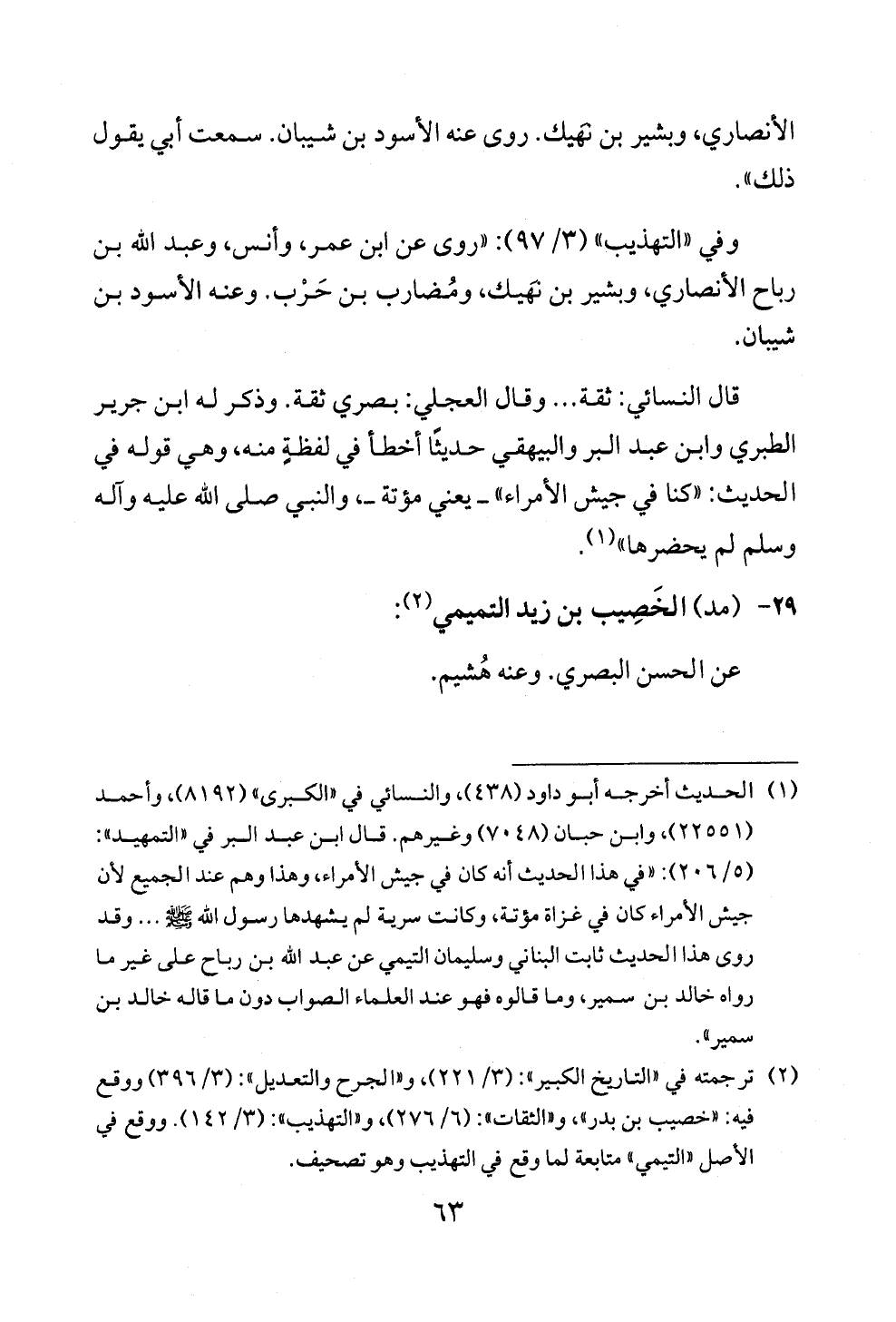 قال النسائي: ثقة ... وقال العجلي: بصري ثقة. وذكر له ابن جرير الطبري وابن عبد البر والبيهقي حديثًا أخطأ في لفظةٍ منه، وهي قوله في الحديث: «كنا في جيش الأمراء» ــ يعني مؤتة ــ، والنبي صلى الله عليه وآله وسلم لم يحضرها» (¬١).