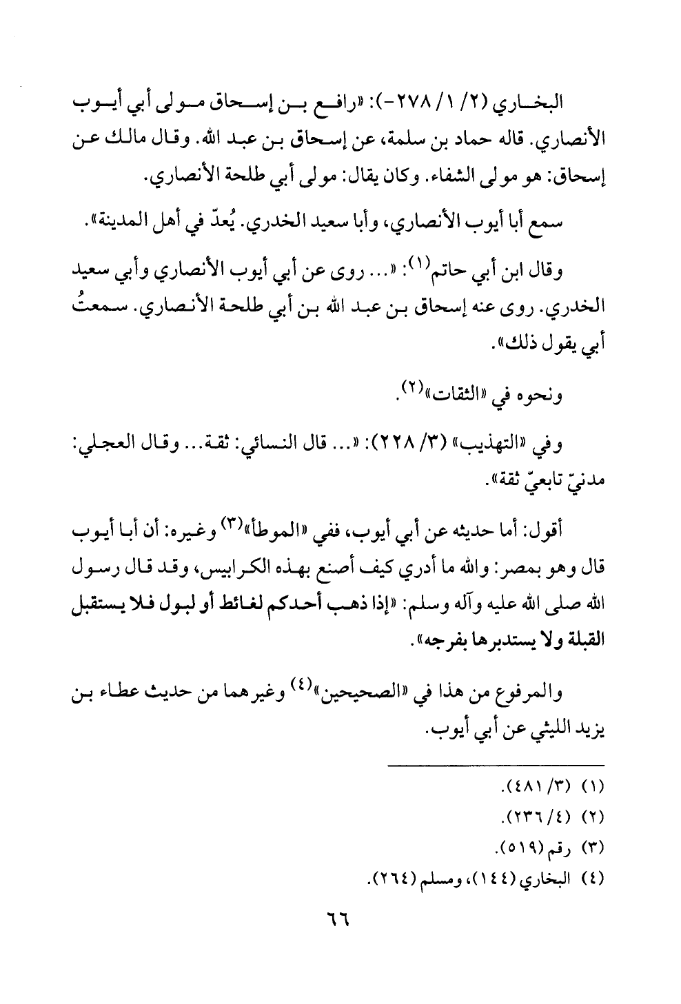 أقول: أما حديثه عن أبي أيوب، ففي «الموطأ» (¬٣) وغيره: أن أبا أيوب قال وهو بمصر: والله ما أدري كيف أصنع بهذه الكرابيس، وقد قال رسول الله صلى الله عليه وآله وسلم: «إذا ذهب أحدكم لغائط أو لبول فلا يستقبل القبلة ولا يستدبرها بفرجه».