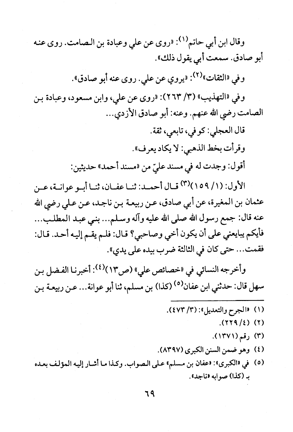 الأول: (١/ ١٥٩) (¬٣) قال أحمد: ثنا عفان، ثنا أبو عوانة، عن عثمان بن المغيرة، عن أبي صادق، عن ربيعة بن ناجد، عن علي رضي الله عنه قال: جمع رسول الله صلى الله عليه وآله وسلم ... بني عبد المطلب ... فأيكم يبايعني على أن يكون أخي وصاحبي؟ قال: فلم يقم إليه أحد. قال: فقمت ... حتى كان في الثالثة ضرب بيده على يدي».
