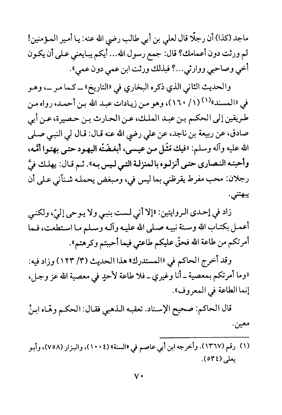 والحديث الثاني الذي ذكره البخاري في «التاريخ» ــ كما مر ــ، وهو في «المسند» (¬١) (١/ ١٦٠)، وهو من زيادات عبد الله بن أحمد، رواه من طريقين إلى الحكم بن عبد الملك، عن الحارث بن حصيرة، عن أبي صادق، عن ربيعة بن ناجد، عن علي رضي الله عنه قال: قال لي النبي صلى الله عليه وآله وسلم: «فيك مَثَل من عيسى، أبغضَتْه اليهود حتى بهتوا أمَّه، وأحبته النصارى حتى أنزلوه بالمنزلة التي ليس به». ثم قال: يهلك فيَّ رجلان: محب مفرط يقرظني بما ليس في، ومبغض يحمله شنآني على أن يبهتني.