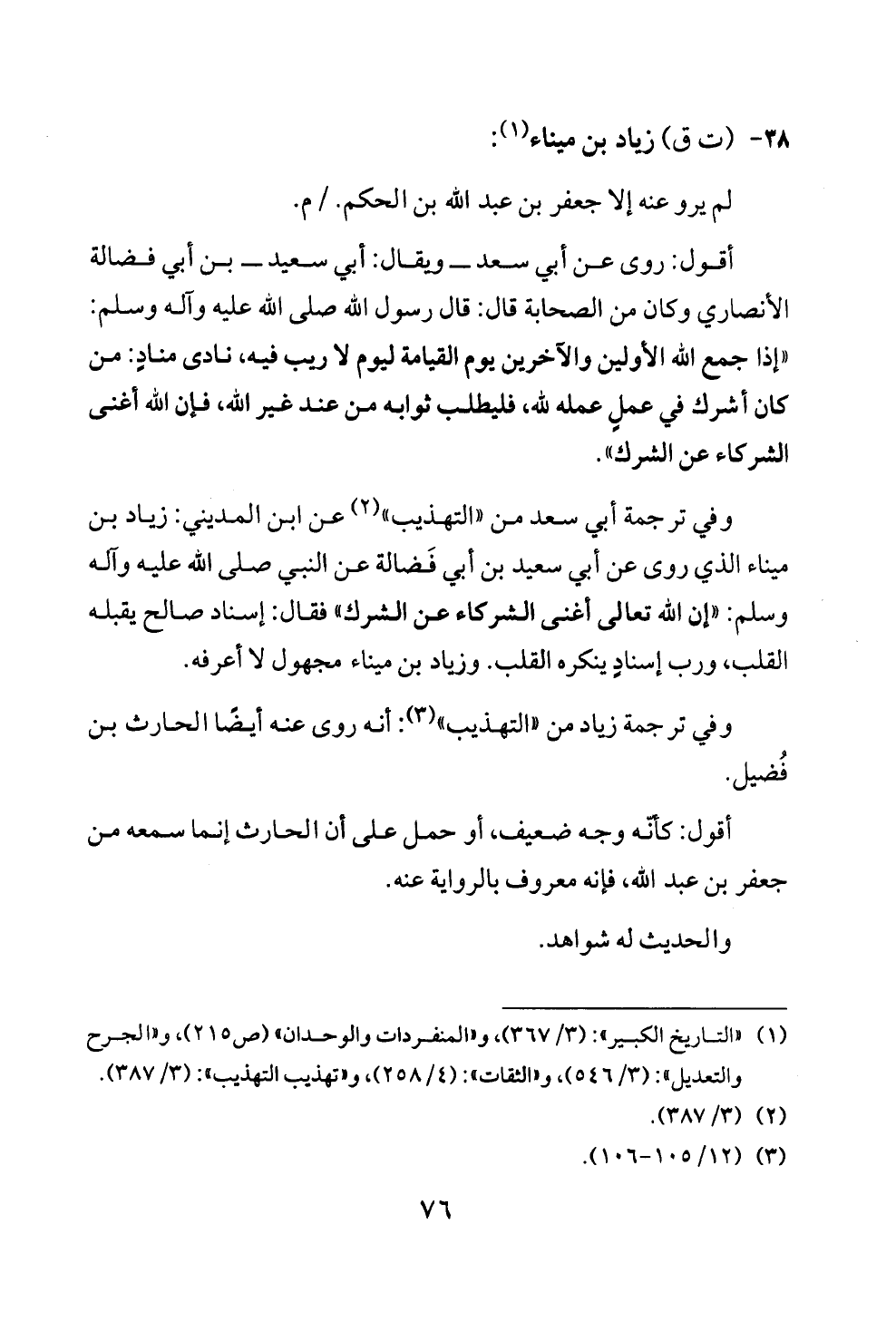 وفي ترجمة أبي سعد من «التهذيب» (¬٢) عن ابن المديني: زياد بن ميناء الذي روى عن أبي سعيد بن أبي فَضالة عن النبي صلى الله عليه وآله وسلم: «إن الله تعالى أغنى الشركاء عن الشرك» فقال: إسناد صالح يقبله القلب، ورب إسنادٍ ينكره القلب. وزياد بن ميناء مجهول لا أعرفه.