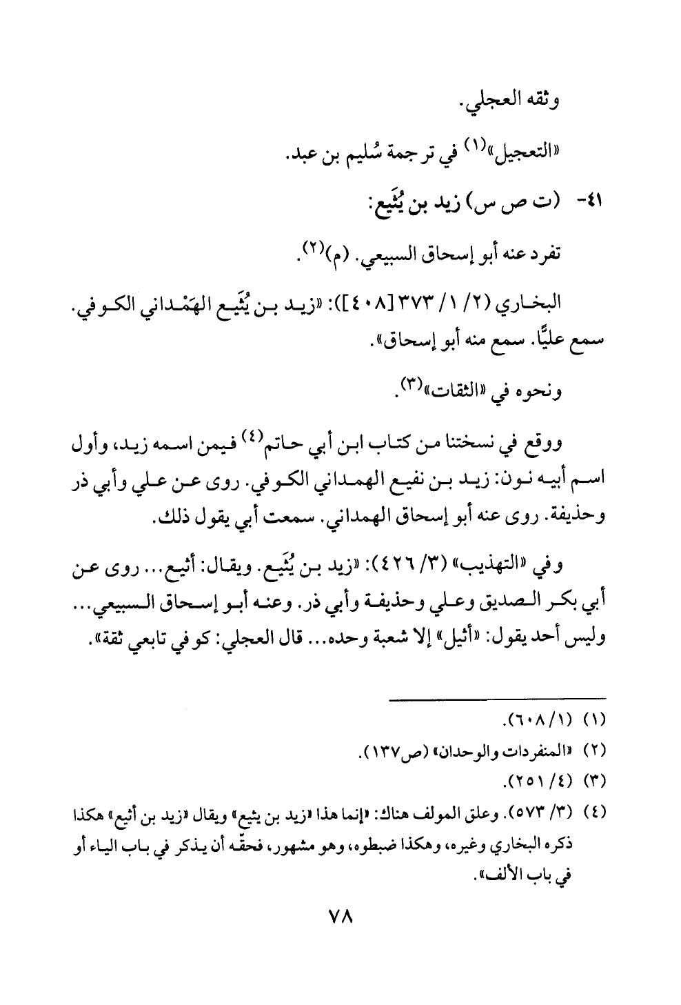 (¬٤) (٣/ ٥٧٣). وعلق المولف هناك: «إنما هذا «زيد بن يثيع» ويقال «زيد بن أثيع» هكذا ذكره البخاري وغيره، وهكذا ضبطوه، وهو مشهور، فحقّه أن يذكر في باب الياء أو في باب الألف».