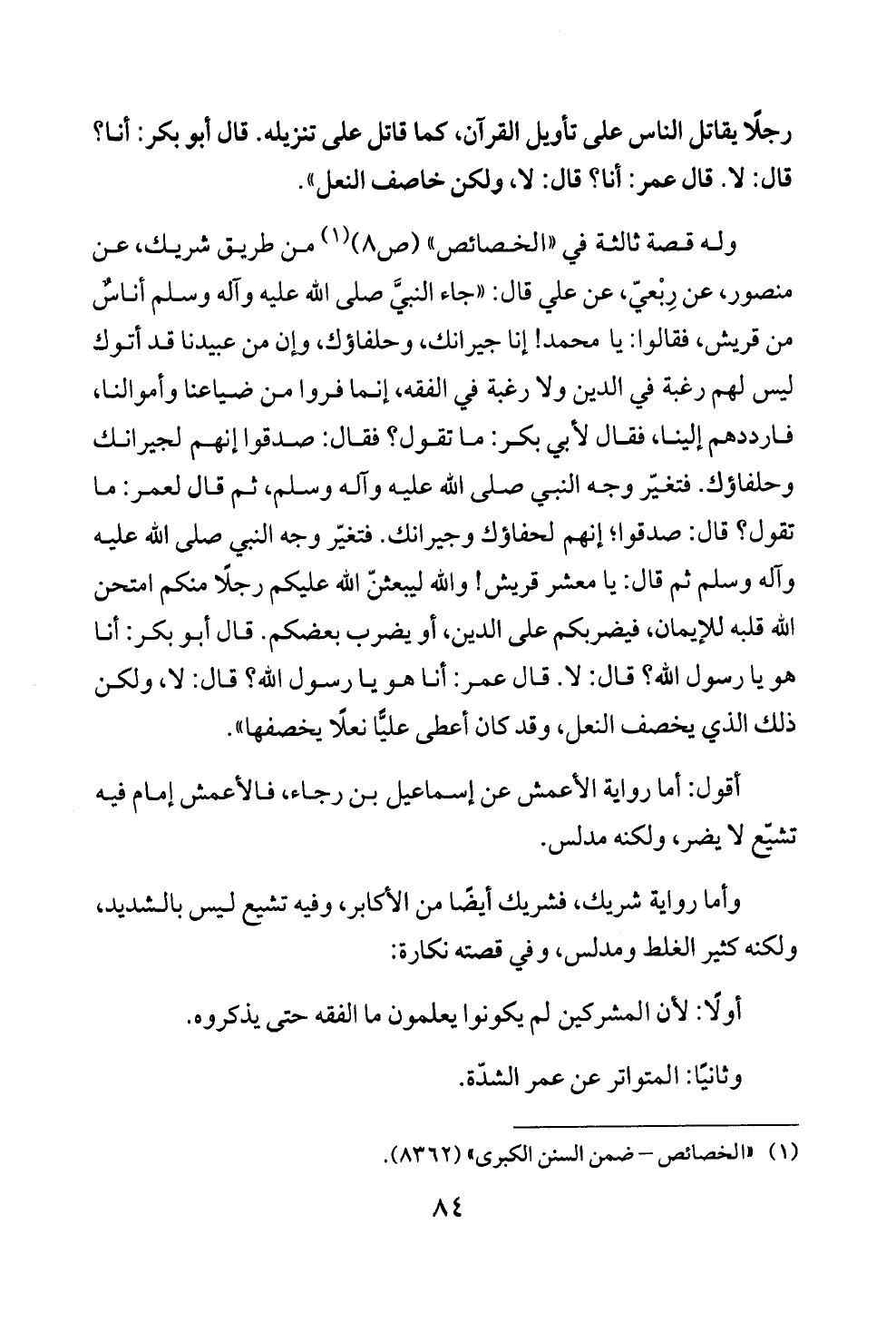 وله قصة ثالثة في «الخصائص» (ص ٨) (¬١) من طريق شريك، عن منصور، عن رِبْعيّ، عن علي قال: «جاء النبيَّ صلى الله عليه وآله وسلم أناسٌ من قريش، فقالوا: يا محمد! إنا جيرانك، وحلفاؤك، وإن من عبيدنا قد أتوك ليس لهم رغبة في الدين ولا رغبة في الفقه، إنما فروا من ضياعنا وأموالنا، فارددهم إلينا، فقال لأبي بكر: ما تقول؟ فقال: صدقوا إنهم لجيرانك وحلفاؤك. فتغيّر وجه النبي صلى الله عليه وآله وسلم، ثم قال لعمر: ما تقول؟ قال: صدقوا؛ إنهم لحفاؤك وجيرانك. فتغيّر وجه النبي صلى الله عليه وآله وسلم ثم قال: يا معشر قريش! والله ليبعثنّ الله عليكم رجلًا منكم امتحن الله قلبه للإيمان، فيضربكم على الدين، أو يضرب بعضكم. قال أبو بكر: أنا هو يا رسول الله؟ قال: لا. قال عمر: أنا هو يا رسول الله؟ قال: لا، ولكن ذلك الذي يخصف النعل، وقد كان أعطى عليًّا نعلًا يخصفها».