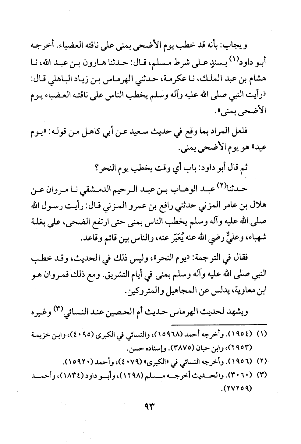 فقال في الترجمة: «يوم النحر»، وليس ذلك في الحديث، وقد خطب النبي صلى الله عليه وآله وسلم بمنى في أيام التشريق. ومع ذلك فمروان هو ابن معاوية، يدلس عن المجاهيل والمتروكين.