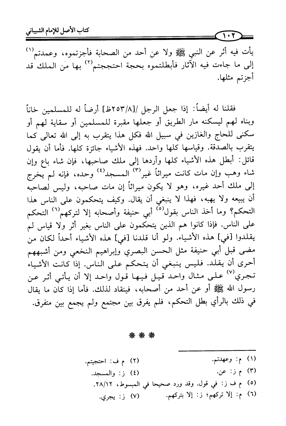 فقلنا له أيضاً: إذا جعل الرجل أرضاً له للمسلمين خاناً وبناه لهم ليسكنه مار الطريق أو جعلها مقبرة للمسلمين أو سقاية لهم أو سكنى للحاج والغازين في سبيل الله فكل هذا يتقرب به إلى الله تعالى كما يتقرب بالصدقة. وقياسها كلها واحد. فهذه الأشياء جائزة كلها. فأما أن يقول قائل: أبطل هذه الأشياء كلها وأردها إلى ملك صاحبها، فإن شاء باع وإن شاء وهب وإن مات كانت ميراثاً غير (¬3) المسجد (¬4) وحده، فإنه لم يخرج إلى ملك أحد غيره، وهو لا يكون ميراثاً إن مات صاحبه، وليس لصاحبه أن يبيعه ولا يهبه، فهذا لا ينبغي أن يقال. وكيف يتحكمون على النَّاس هذا التحكم؟ وما أخذ النَّاس بقول (¬5) أبي حنيفة وأصحابه إِلا لتركهم (¬6) التحكم على النَّاس. فإذا كانوا هم الذين يتحكمون على النَّاس بغير أثر ولا قياس لم يقلدوا [في] هذه الأشياء. ولو أنا قلدنا [في] هذه الأشياء أحداً لكان من مضى قبل أبي حنيفة مثل الحسن البصري دابراهيم النخعي ومن أشبههم أحرى أن يقلد. فليس ينبغي أن يتحكم على النَّاس. إذا كانت الأشياء تجري (¬7) على مثال واحد قيل فيها قول واحد إِلا أن يأتي أثر عن رسول الله - صلى الله عليه وسلم - أو عن أحد من أصحابه، فينقاد لذلك. فأما إذا كان ما يقال في ذلك بالرأي بطل التحكم، فلم يفرق بين مجتمع ولم يجمع بين متفرق.