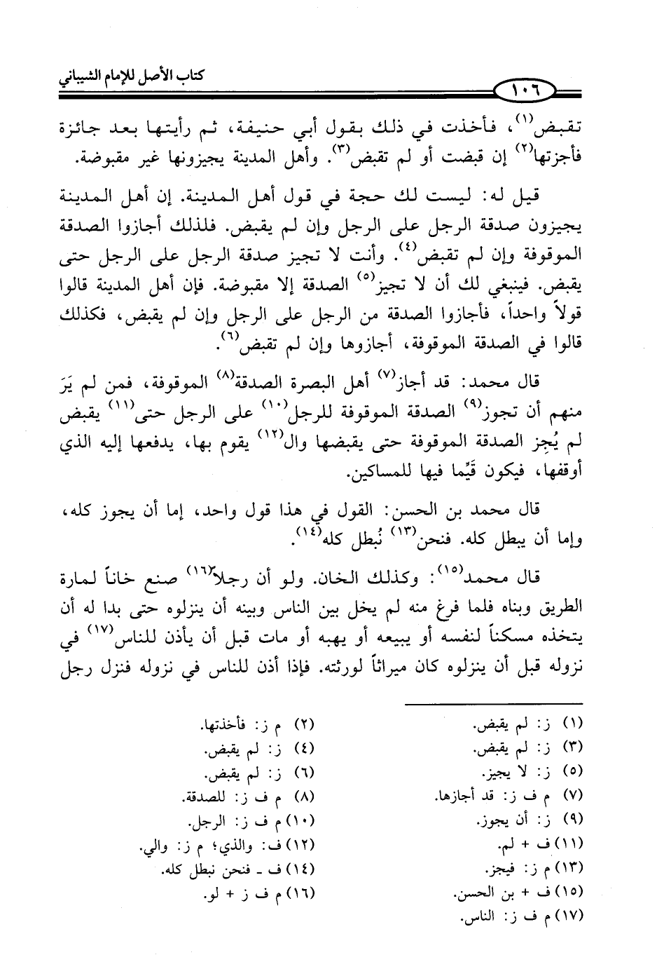 قيل له: ليست لك حجة في قول أهل المدينة. إن أهل المدينة يجيزون صدقة الرجل على الرجل وإن لم يقبض. فلذلك أجازوا الصدقة الموقوفة وإن لم تقبض (¬4). وأنت لا تجيز صدقة الرجل على الرجل حتى يقبض. فينبغي لك أن لا تجيز (¬5) الصدقة إِلا مقبوضة. فإن أهل المدينة قالوا قولَا واحداً، فأجازوا الصدقة من الرجل على الرجل وإن لم يقبض، فكذلك قالوا في الصدقة الموقوفة، أجازوها وإن لم تقبض (¬6).