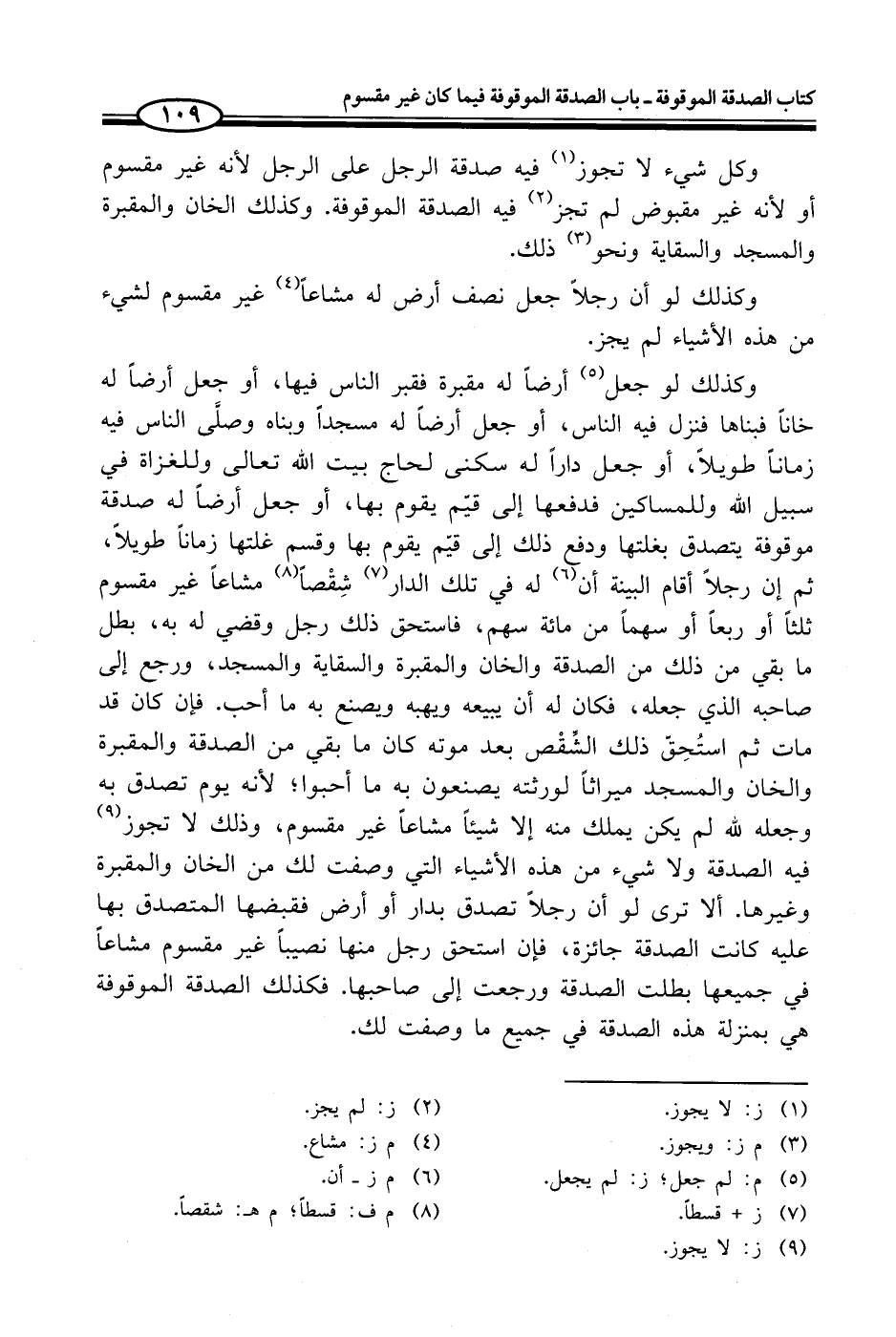 وكل شيء لا تجوز (¬1) فيه صدقة الرجل على الرجل لأنه غير مقسوم أو لأنه غير مقبوض لم تجز (¬2) فيه الصدقة الموقوفة. وكذلك الخان والمقبرة والمسجد والسقاية ونحو (¬3) ذلك.