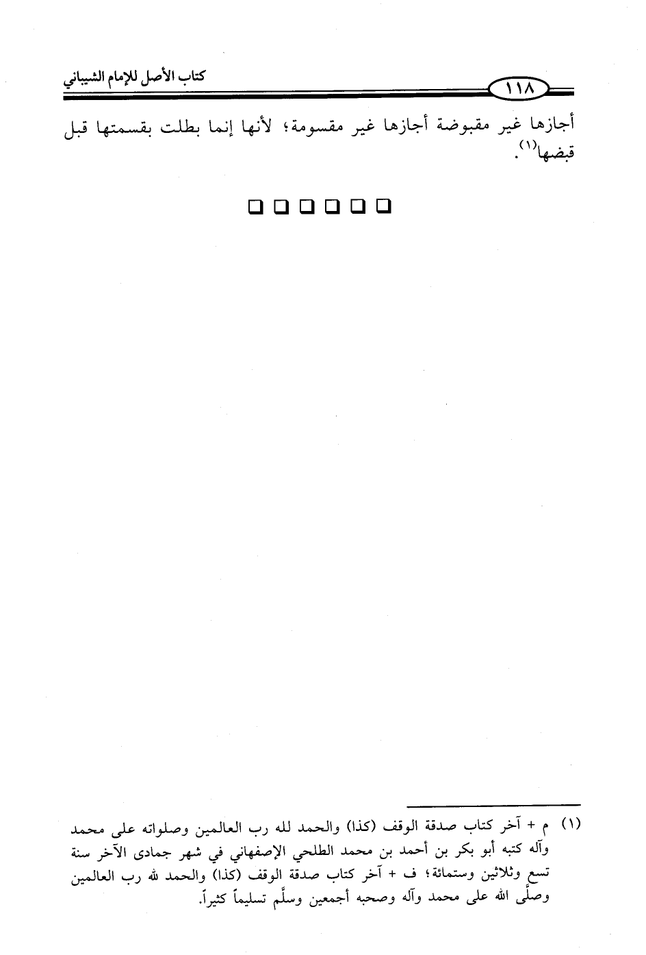 (¬1) م + آخر كتاب صدقة الوقف (كذا) والحمد لله رب العالمين وصلواته على محمد وآله كتبه أبو بكر بن أحمد بن محمد الطلحي الإصفهاني في شهر جمادى الآخر سنة تسع وثلاثين وستمائة؛ ف + آخر كتاب صدقة الوقف (كذا) والحمد لله رب العالمين وصلَّى الله على محمد وآله وصحبه أجمعين وسلَّم تسليماً كثيراً.