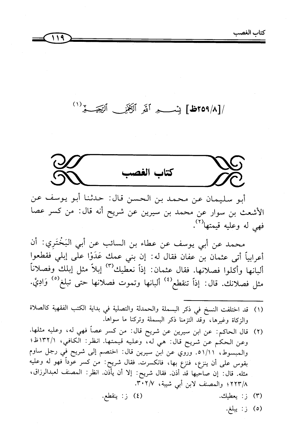 (¬2) قال الحاكم: عن ابن سيرين عن شريح قال: من كسر عصاً فهي له، وعليه مثلها. وعن الحكم عن شريح قال: هي له، وعليه قيمتها. انظر: الكافي، 1/ 132 ظ؛ والمبسوط، 1/ 511. وروي عن ابن سيرين قال: اختصم إلى شريح في رجل ساوم بقوس على أن ينزع، فنزع بها، فانكسرت. فقال شريح: من كسر عودًا فهو له وعليه مثله. قال: إن صاحبها قد أذن. فقال شريح: إِلا أن يأذن. انظر: المصنف لعبد الرزاق، 8/ 223؛ والمصنف لابن أبي شيبة، 7/ 302.