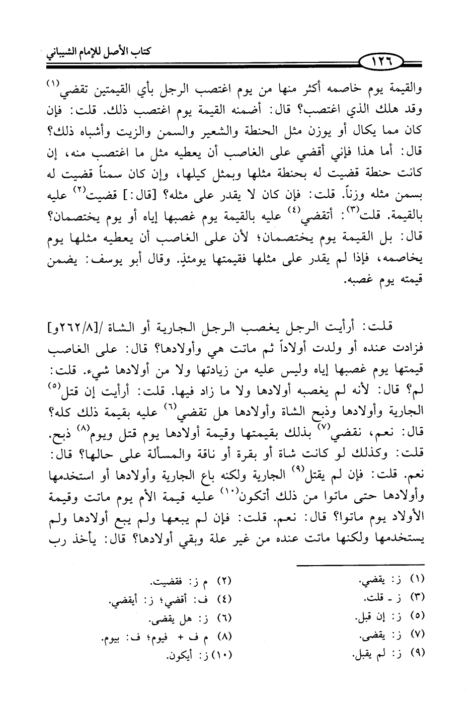 قلت: أرأيت الرجل يغصب الرجل الجارية أو الشاة فزادت عنده أو ولدت أولاداً ثم ماتت هي وأولادها؟ قال: على الغاصب قيمتها يوم غصبها إياه وليس عليه من زيادتها ولا من أولادها شيء. قلت: لم؟ قال: لأنه لم يغصبه أولادها ولا ما زاد فيها. قلت: أرأيت إن قتل (¬5) الجارية وأولادها وذبح الشاة وأولادها هل تقضي (¬6) عليه بقيمة ذلك كله؟ قال: نعم، نقضي (¬7) بذلك بقيمتها وقيمة أولادها يوم قتل ويوم (¬8) ذبح. قلت: وكذلك لو كانت شاة أو بقرة أو ناقة والمسألة على حالها؟ قال: نعم. قلت: فإن لم يقتل (¬9) الجارية ولكنه باع الجارية وأولادها أو استخدمها وأولادها حتى ماتوا من ذلك أتكون (¬10) عليه قيمة الأم يوم ماتت وقيمة الأولاد يوم ماتوا؟ قال: نعم. قلت: فإن لم يبعها ولم يبع أولادها ولم يستخدمها ولكنها ماتت عنده من غير علة وبقي أولادها؟ قال: يأخذ رب